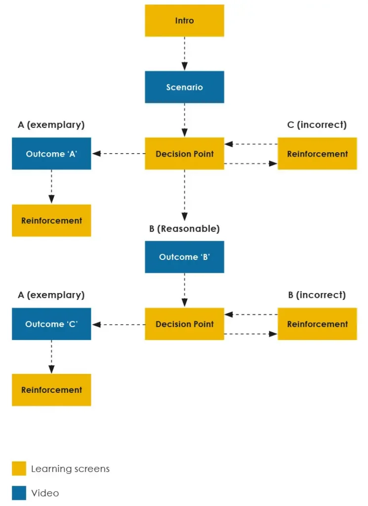 Perhaps the most popular dramatic form in learning at the moment is what’s often referred to as branching drama or branching scenarios. The structure shown above allows learners to make decisions that affect the narrative. They get to see the consequences of their decision-making in a tailored experience. Branching dramas can be designed hand-in-hand with the overall modular learning design so that the learning experience is seamless and the learning as effective as it can be.