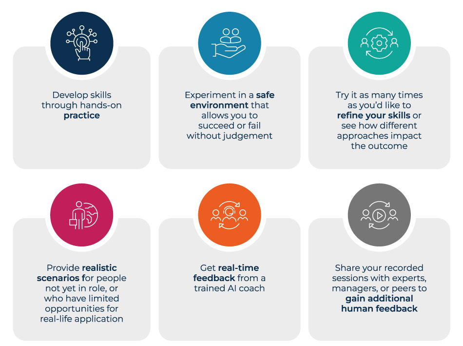 - Immersive AI simulations can allow learners to practice performance conversations safely and realistically, at their own pace.