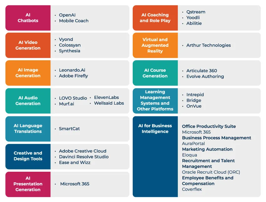 Having explored the strategic landscape of AI in L&D, let’s look at the tools making this transformation possible. The collection of AI tools and platforms that we have been reviewing at GP Strategies is expanding all the time. We are seeing new tools entering into the space, and legacy tools that are adding AI features as we go. As with any AI tool, it’s important to get client approval to use AI and ensure that all tools are vetted and secure.