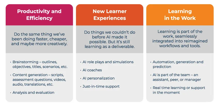 The diagram above outlines three different areas in which our clients often find themselves. Many of our clients are still in the first category, using AI for productivity and operational efficiency, trying to accomplish tasks faster or more cost-effectively by automating repetitive tasks. Tools like ChatGPT, Copilot, and Learning Content AIQ can streamline the production of learning materials. Here, AI supports L&D teams, but not learners directly.