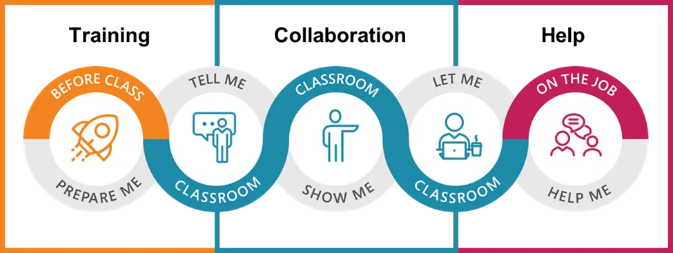 A solution that drives sustainable change must also include multiple knowledge transfer techniques to prepare users to be productive and readily support themselves on the job. The five techniques within the Adult Learning Model are:
