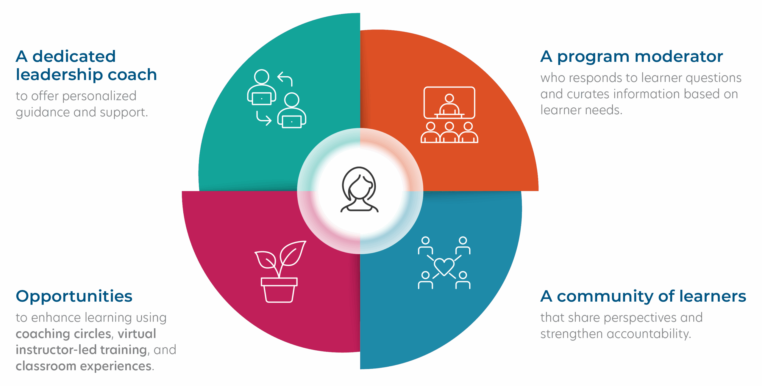 The Leadership Acceleration experience seamlessly blends digital learning with human connection and provides learners with: