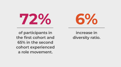 72% of the female participants in the first cohort experienced a role movement (either a career progression or a lateral movement). In the second cohort, 65% of the female colleagues experienced role movement. This highlights the program’s effectiveness in facilitating tangible career growth for its participants.
